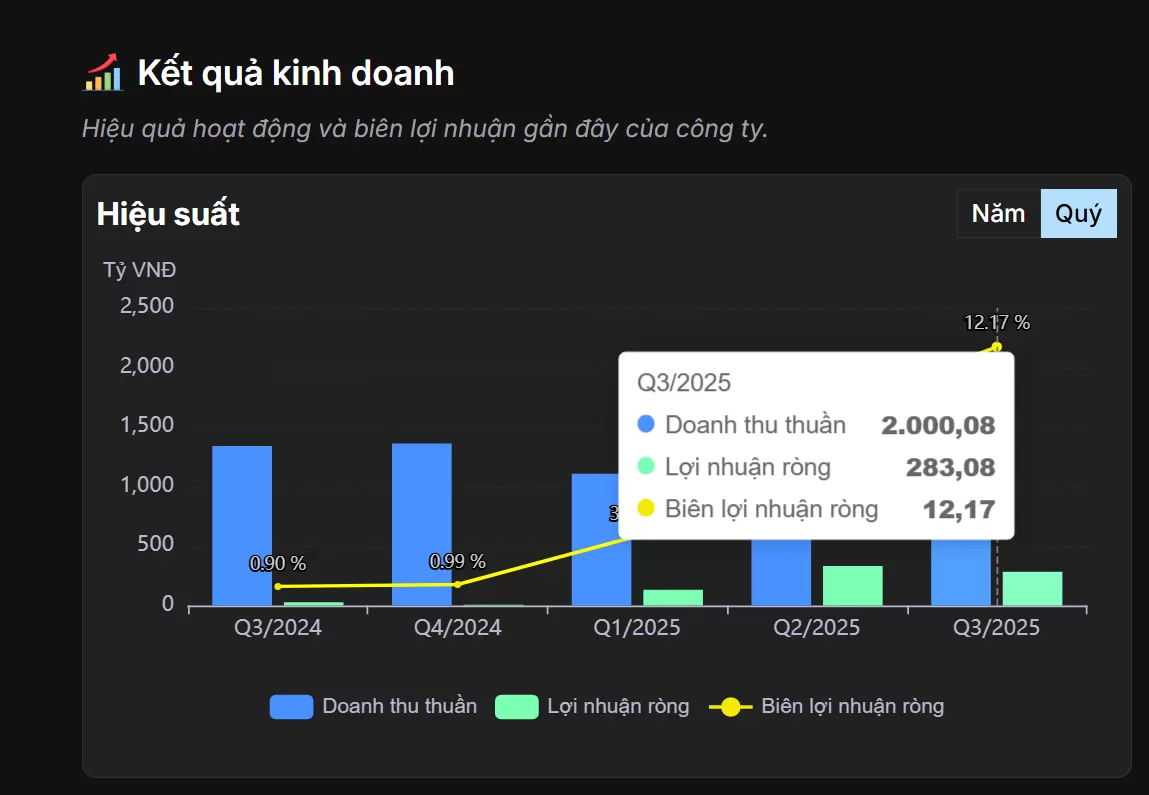 Lũy kế 9 tháng đầu năm 2025: doanh thu ~4.833 tỷ đồng (+36%), lợi nhuận sau thuế ~748 tỷ đồng (gấp ~18 lần cùng kỳ).