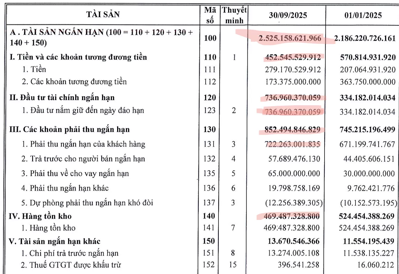 Lượng tiền mặt dồi dào , đáng chú ý tiền đầu tư tài chính đáo hạn tận 736 tỷ